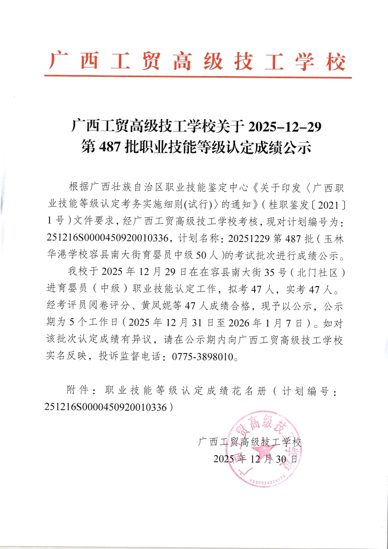 广西工贸高级技工学校关于2025-12-29第487批职业技能等级认定成绩公示