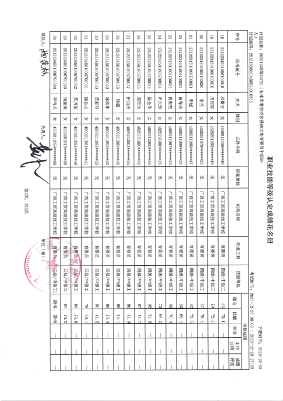 广西工贸高级技工学校关于2025-12-29第490批职业技能等级认定成绩公示