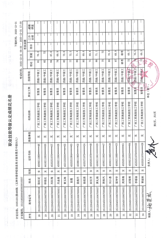 广西工贸高级技工学校关于2025-12-31第488批职业技能等级认定成绩公示
