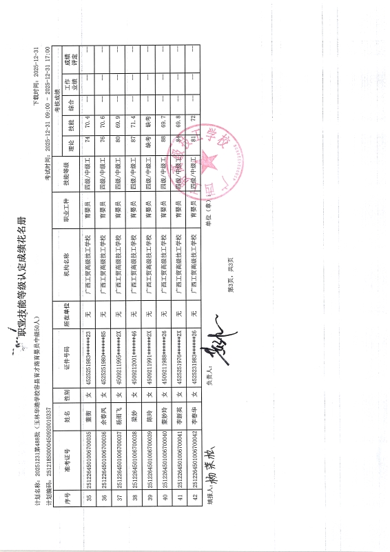 广西工贸高级技工学校关于2025-12-29第490批职业技能等级认定成绩公示