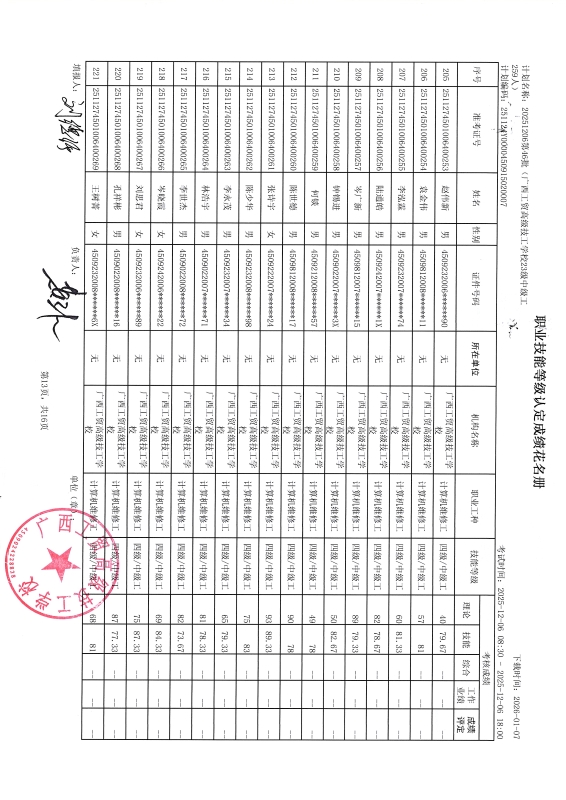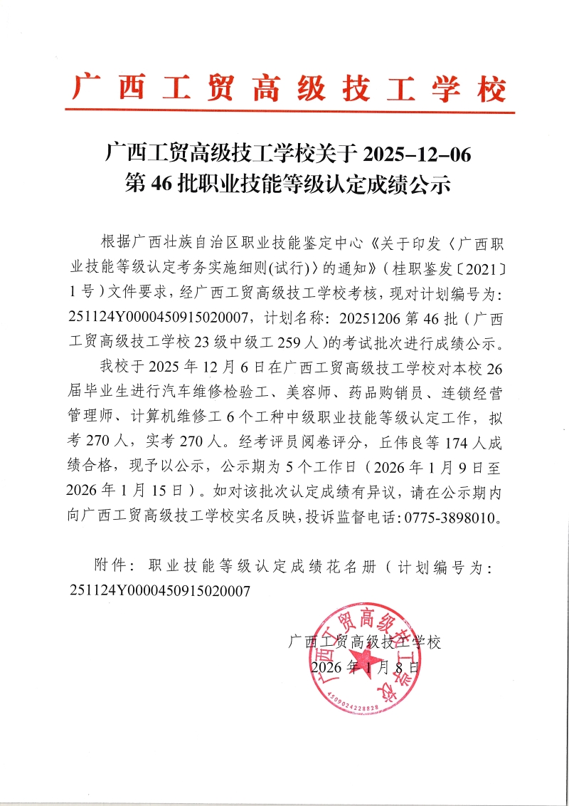 广西工贸高级技工学校关于2025-12-06第46批职业技能等级认定成绩公示
