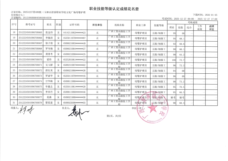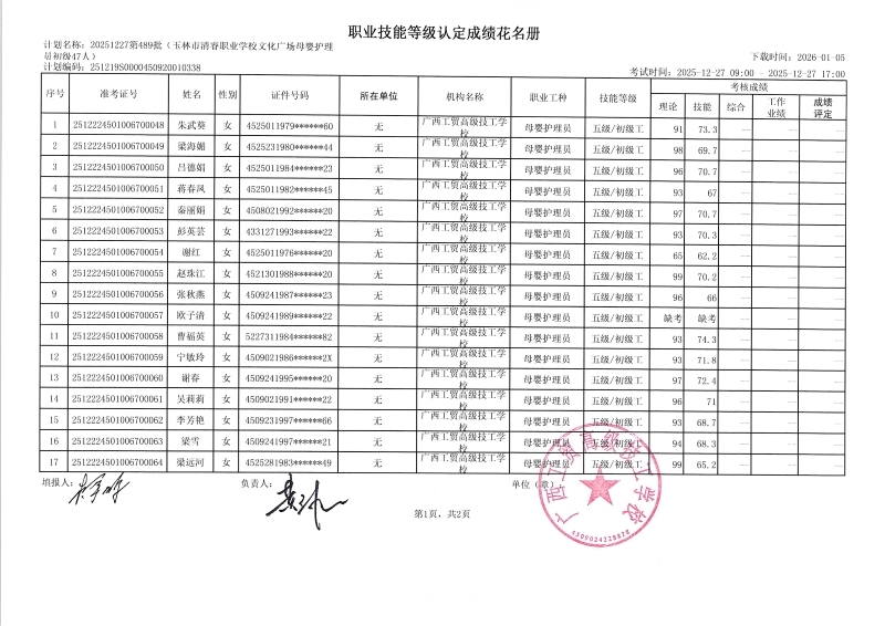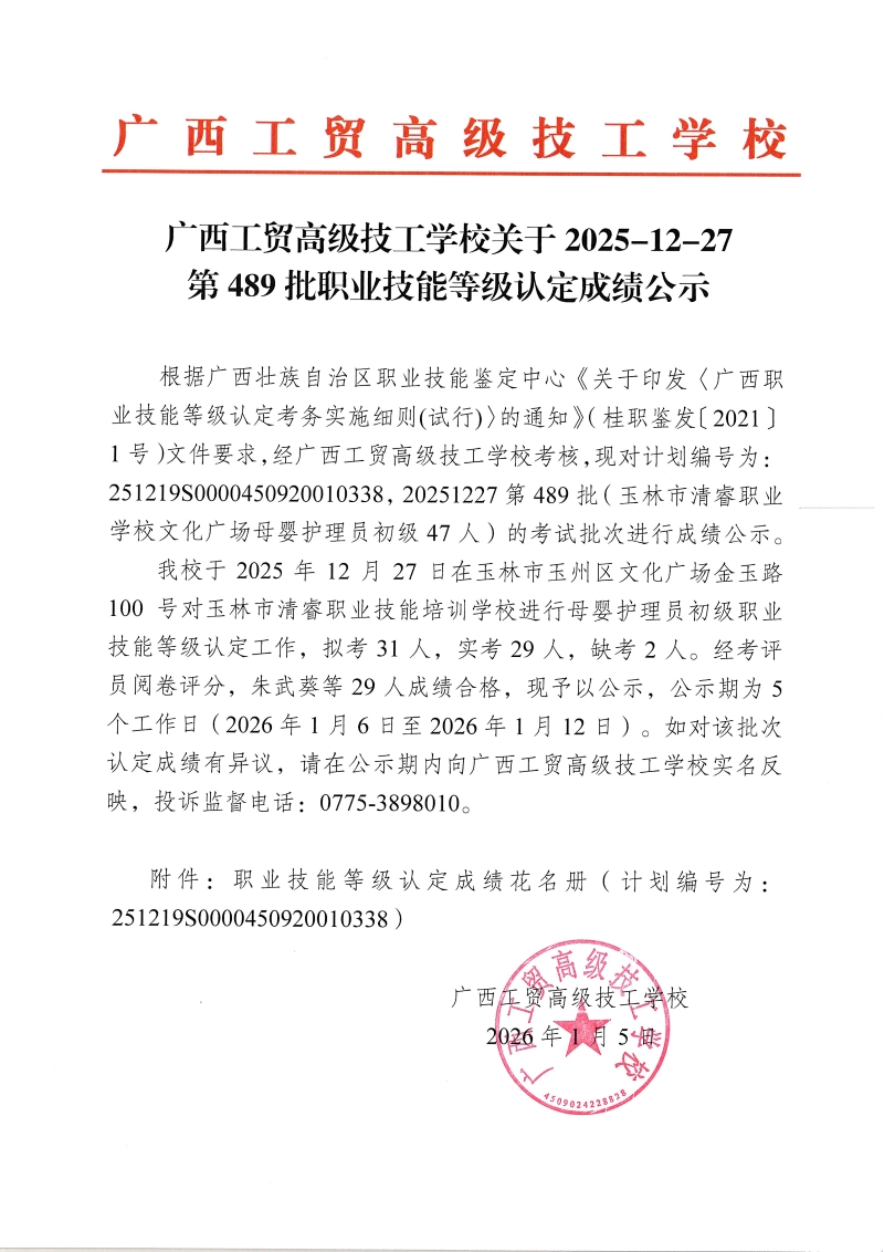 广西工贸高级技工学校关于2025-12-27第489批职业技能等级认定成绩公示