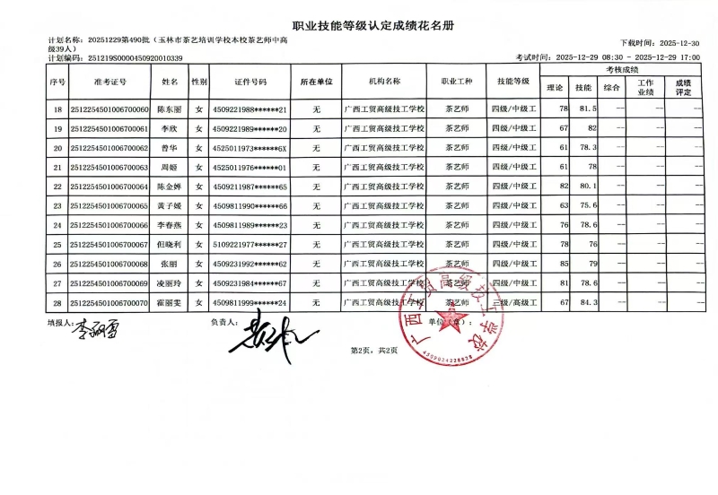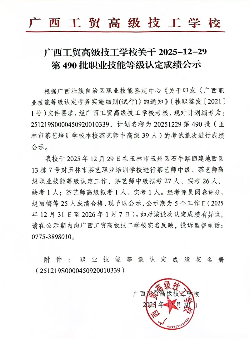 广西工贸高级技工学校关于2025-12-29第490批职业技能等级认定成绩公示