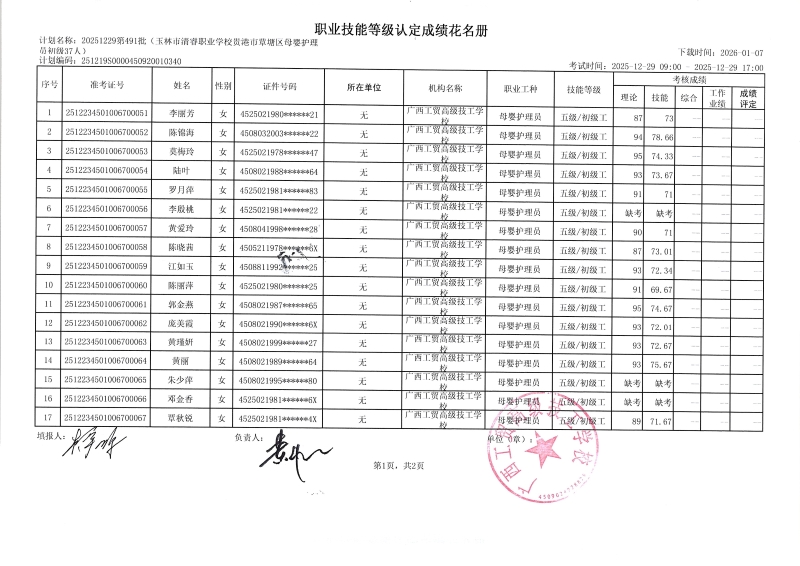 广西工贸高级技工学校关于2025-12-29第491批职业技能等级认定成绩公示
