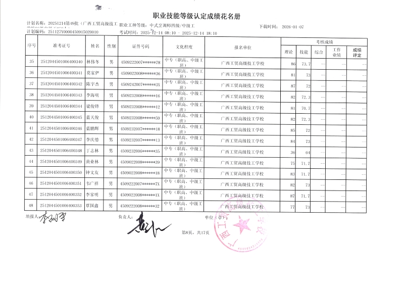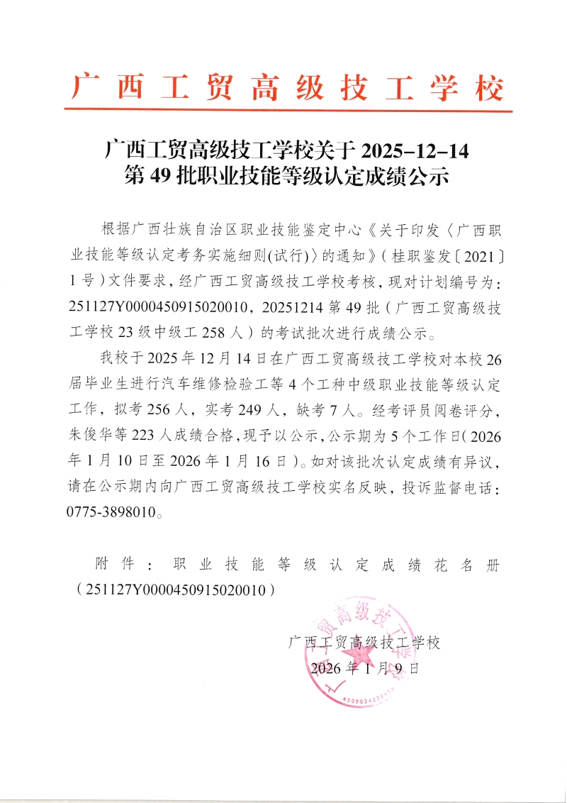 广西工贸高级技工学校关于2025-12-14第49批职业技能等级认定成绩公示