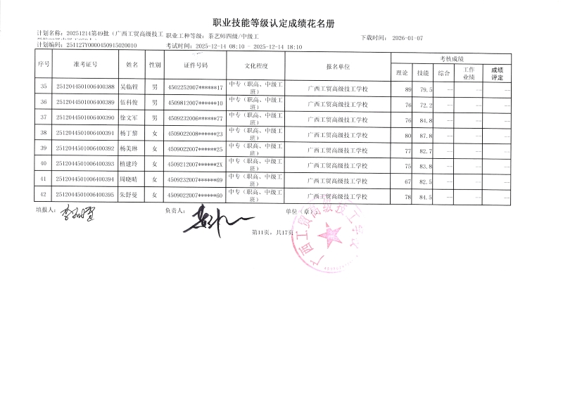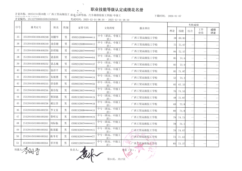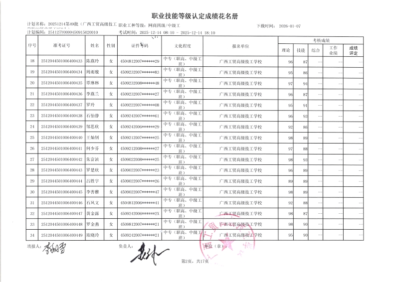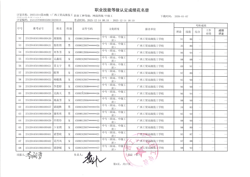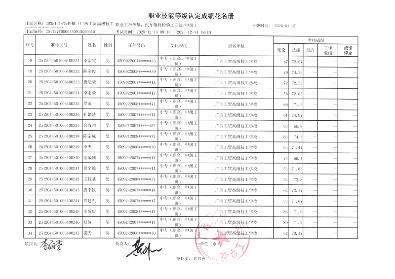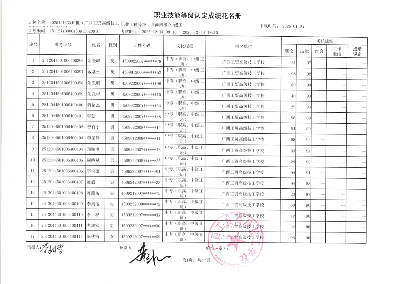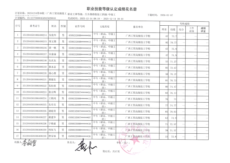 广西工贸高级技工学校关于2025-12-21第51批职业技能等级认定成绩公示