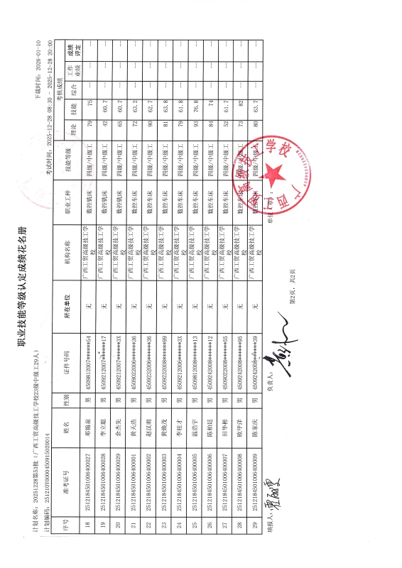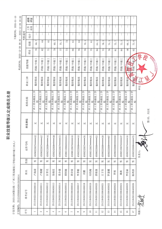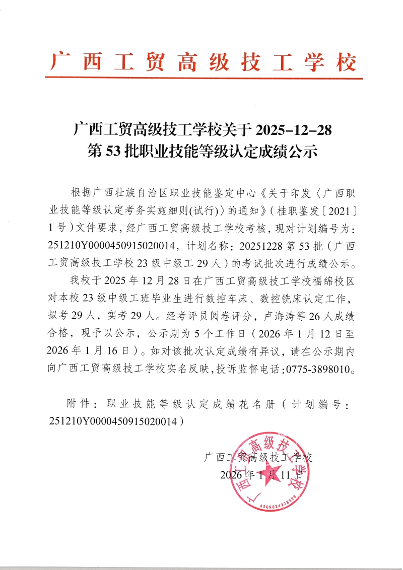 广西工贸高级技工学校关于2025-12-28第53批职业技能等级认定成绩公示