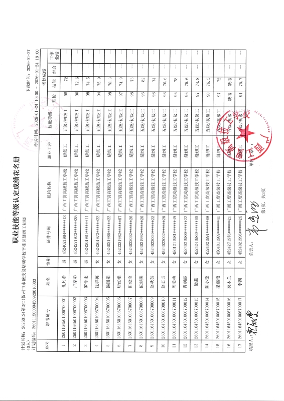 广西工贸高级技工学校关于2026-1-27第5批职业技能等级认定成绩公示