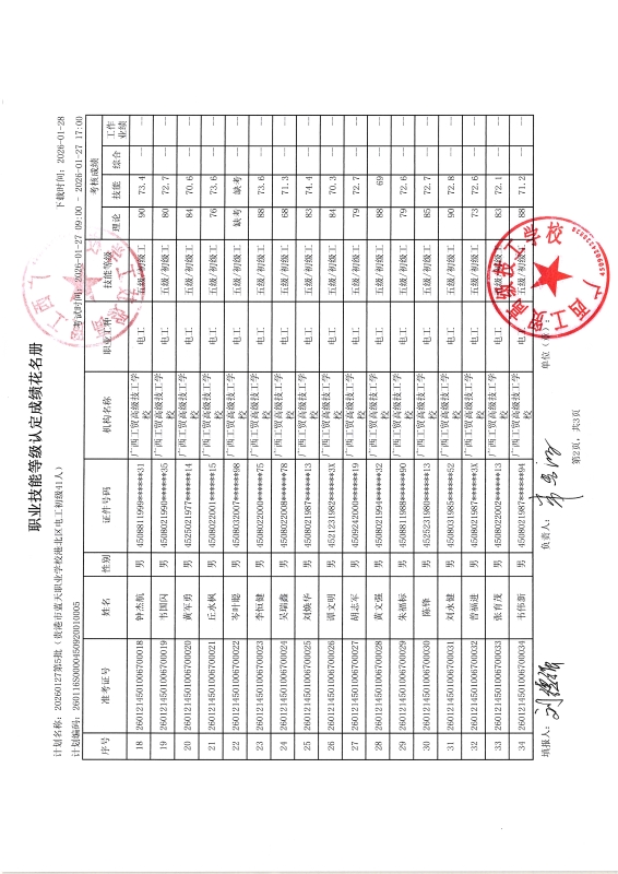 广西工贸高级技工学校关于2026-01-24第3批职业技能等级认定成绩公示