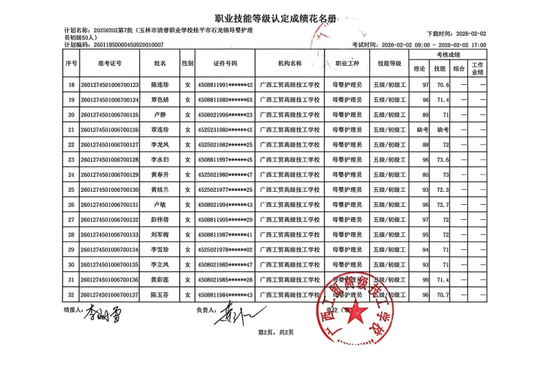 广西工贸高级技工学校关于2026-2-2第7批职业技能等级认定成绩公示