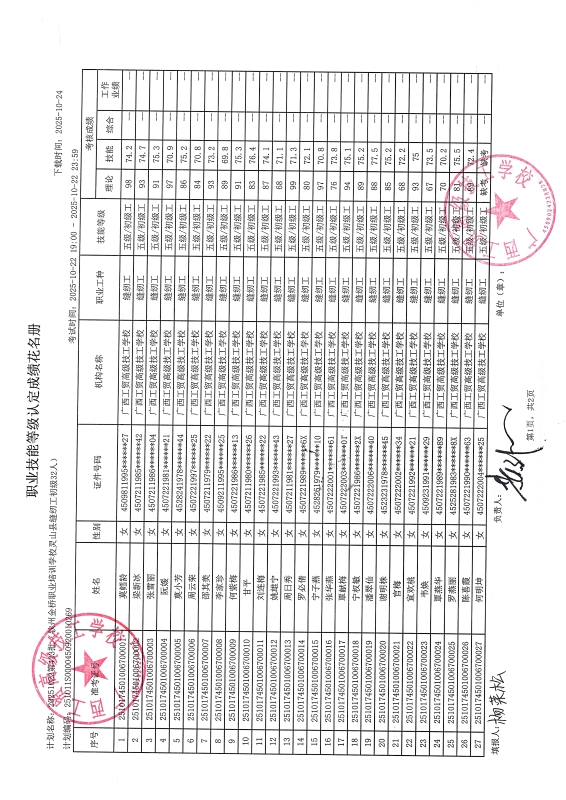 广西工贸高级技工学校关于2025-10-25第23批职业技能等级认定成绩公示