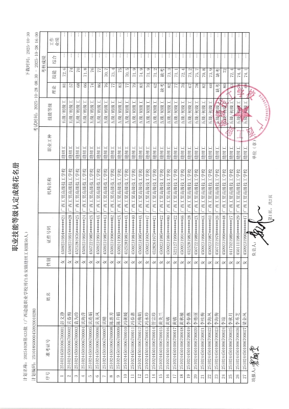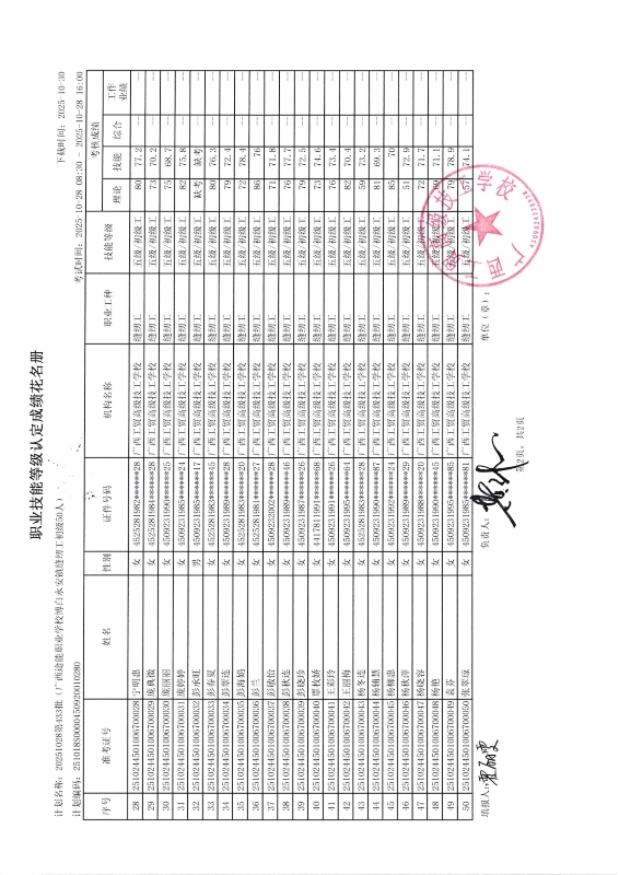 广西工贸高级技工学校关于2025-10-28第433批职业技能等级认定成绩公示