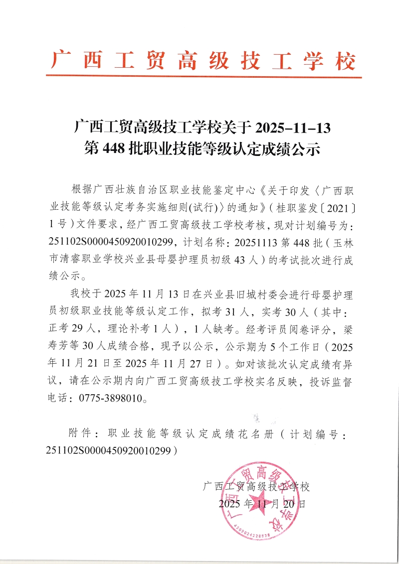 广西工贸高级技工学校关于2025-11-13第448批职业技能等级认定成绩公示