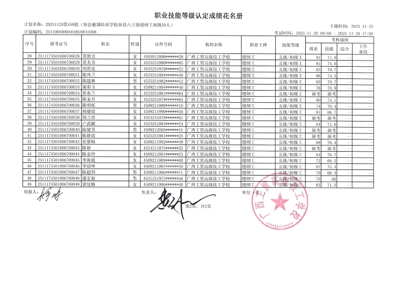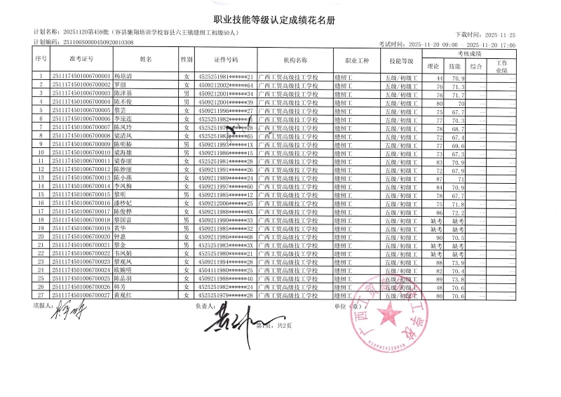 广西工贸高级技工学校关于2025-11-20第459批职业技能等级认定成绩公示