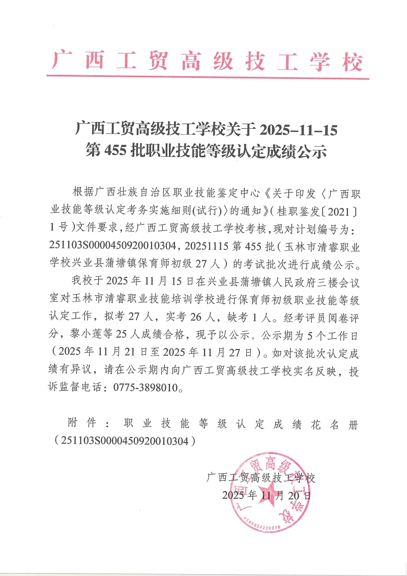 广西工贸高级技工学校关于2025-11-15第455批职业技能等级认定成绩公示