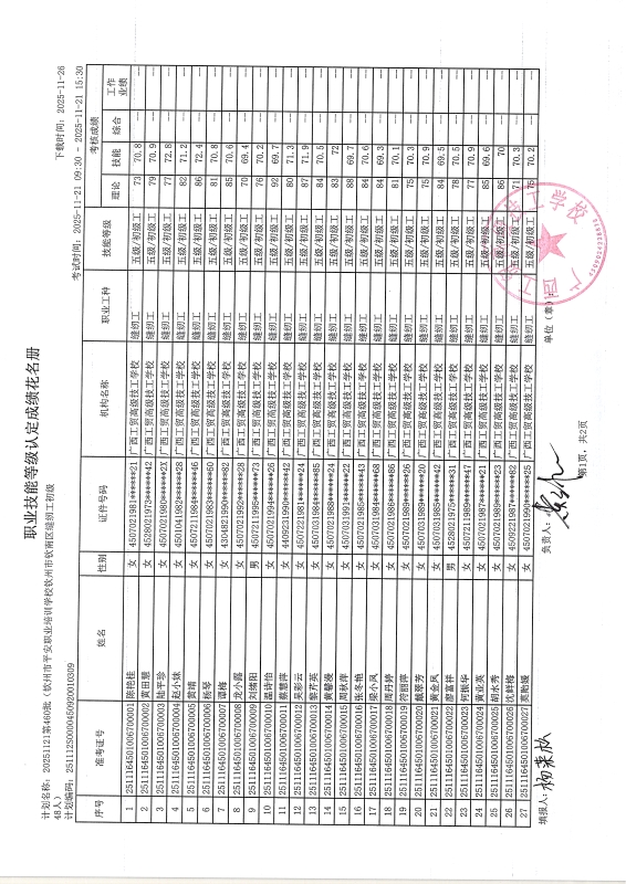 广西工贸高级技工学校关于2025-11-21第460批职业技能等级认定成绩公示