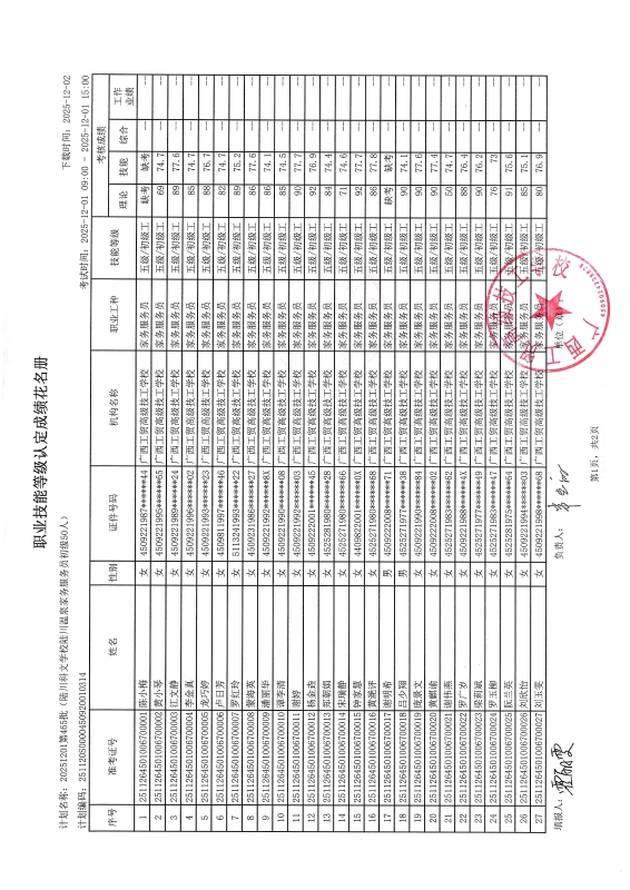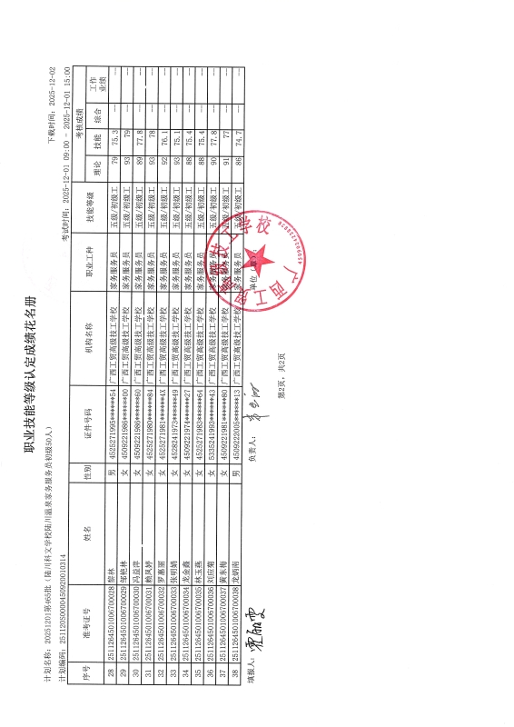 广西工贸高级技工学校关于2025-12-01第465批职业技能等级认定成绩公示