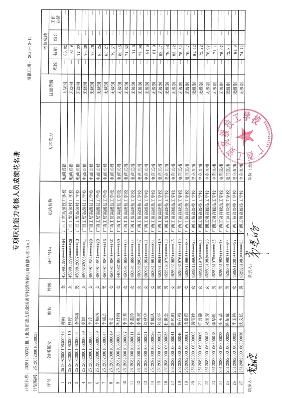 广西工贸高级技工学校关于2025-12-09第32批专项职业能力认定成绩公示