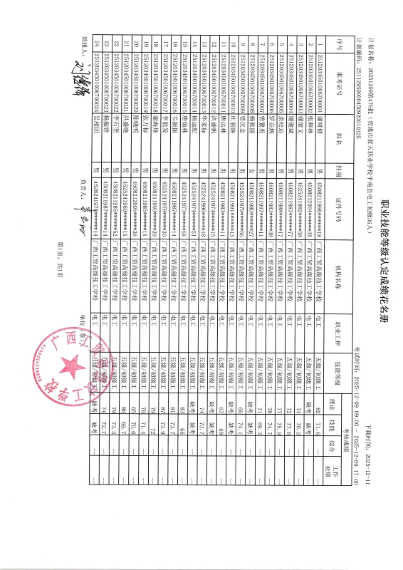 广西工贸高级技工学校关于2025-12-09第476批职业技能等级认定成绩公示