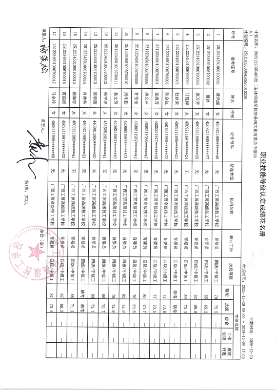 广西工贸高级技工学校关于2025-12-29第487批职业技能等级认定成绩公示