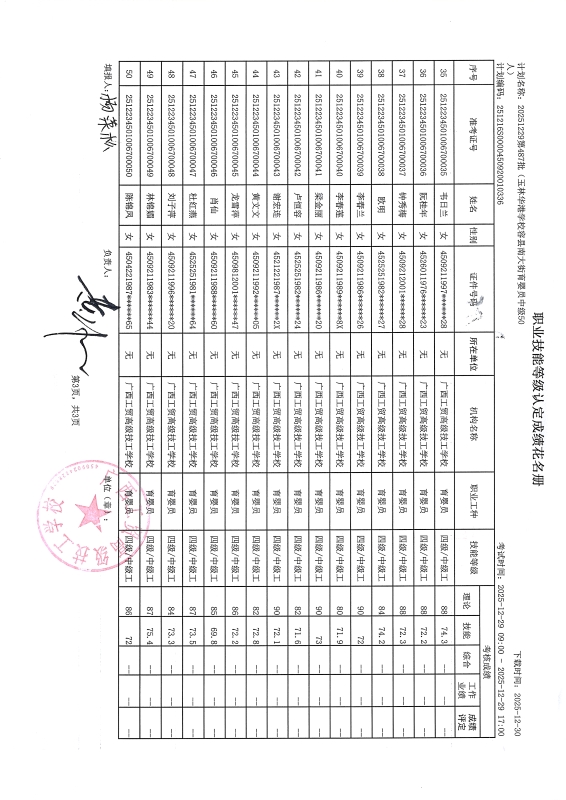 广西工贸高级技工学校关于2025-12-29第490批职业技能等级认定成绩公示