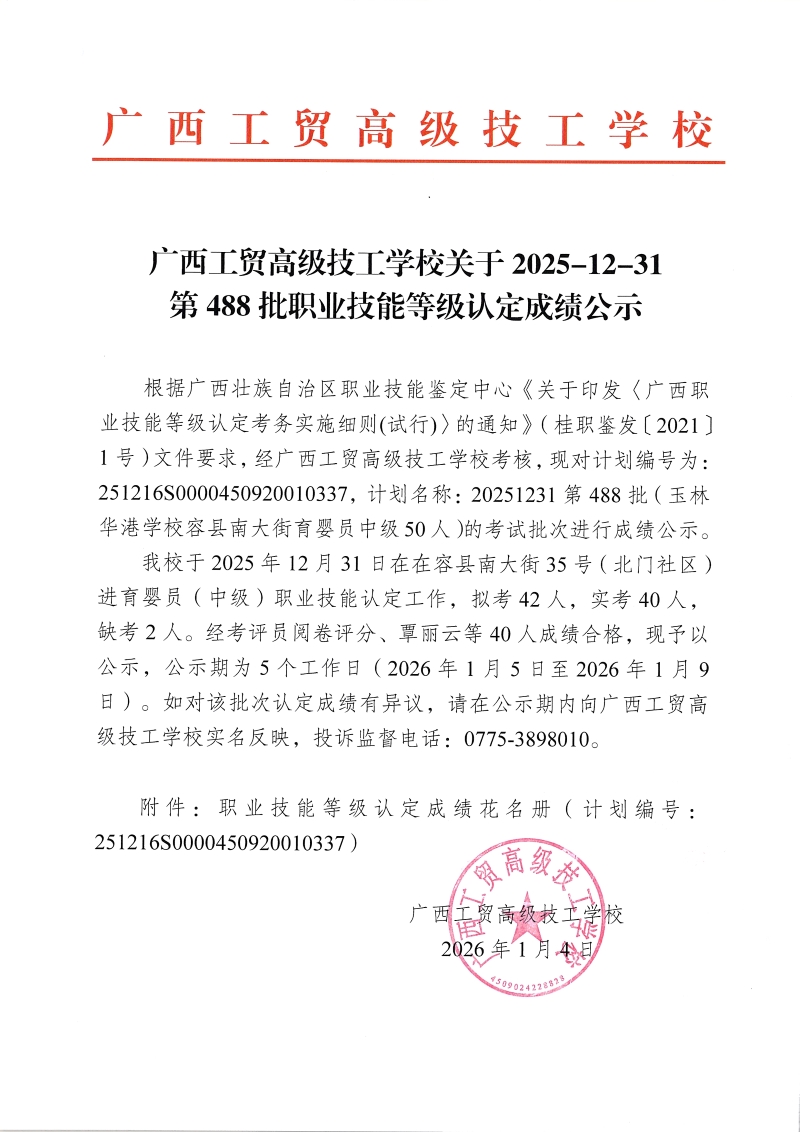 广西工贸高级技工学校关于2025-12-31第488批职业技能等级认定成绩公示