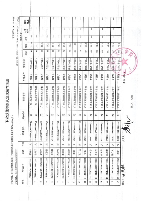 广西工贸高级技工学校关于2025-12-29第490批职业技能等级认定成绩公示