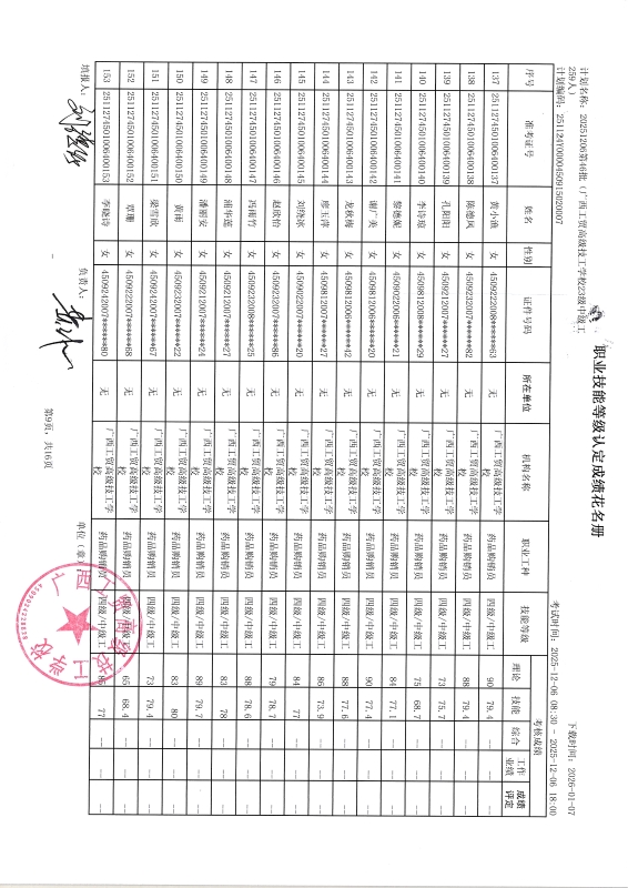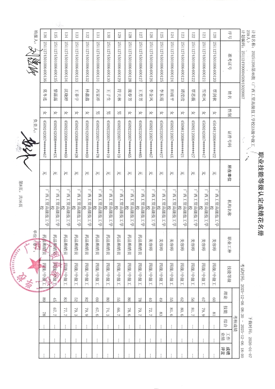 广西工贸高级技工学校关于2025-12-20第50批职业技能等级认定成绩公示