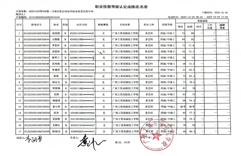 广西工贸高级技工学校关于2025-12-29第490批职业技能等级认定成绩公示