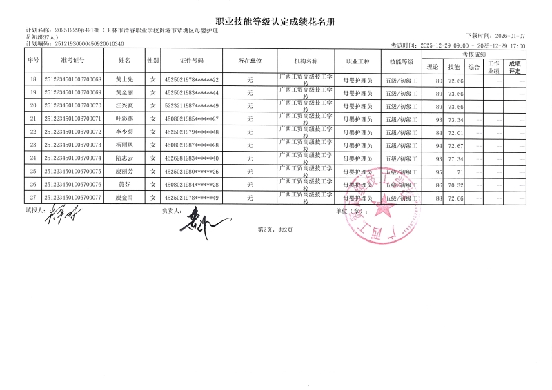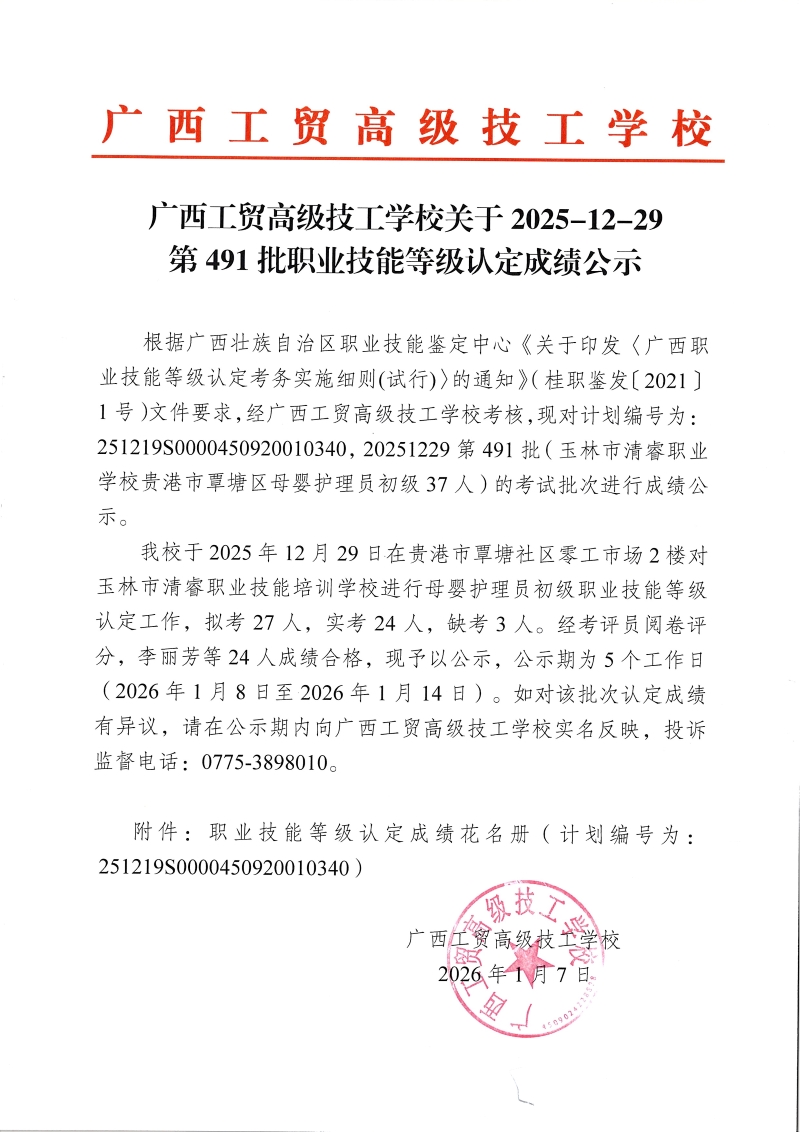广西工贸高级技工学校关于2025-12-29第491批职业技能等级认定成绩公示