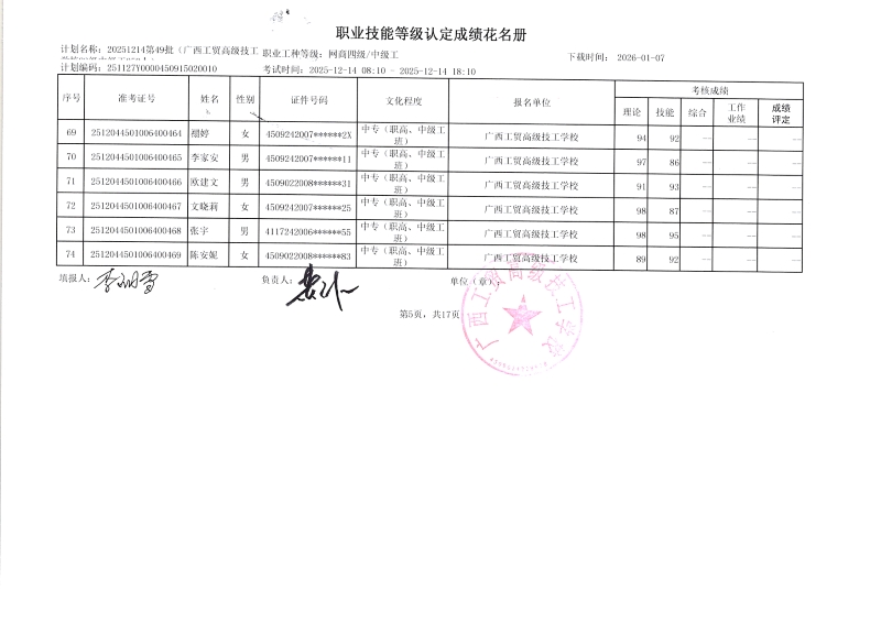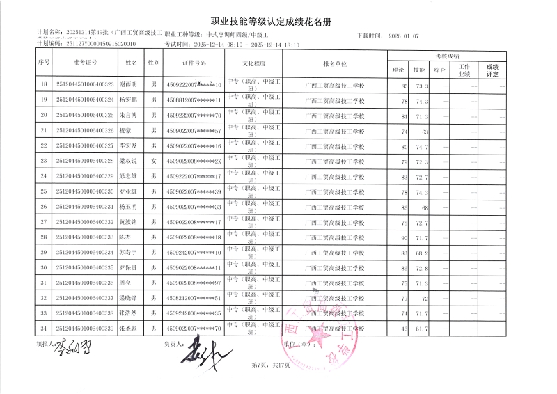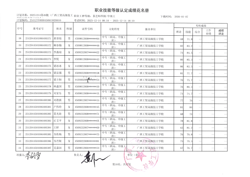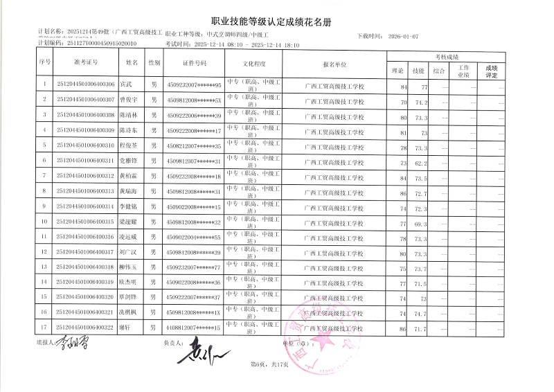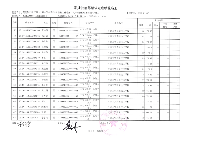 广西工贸高级技工学校关于2025-12-21第51批职业技能等级认定成绩公示