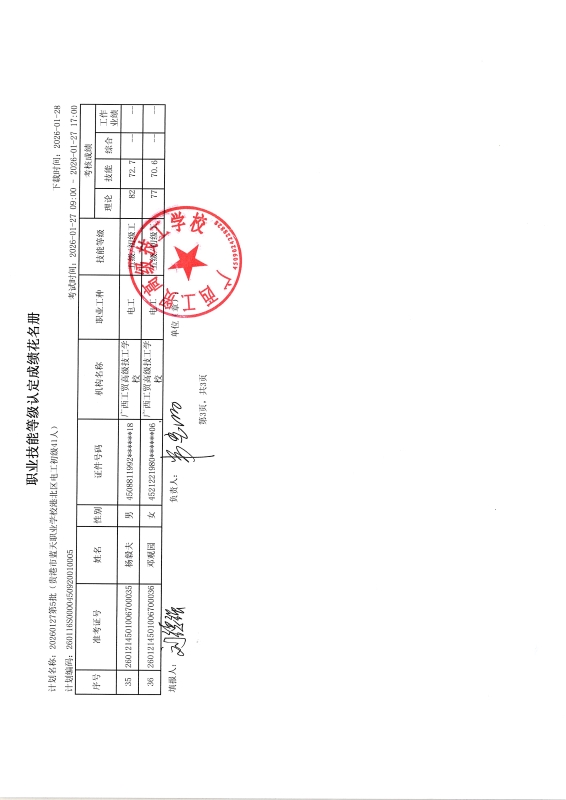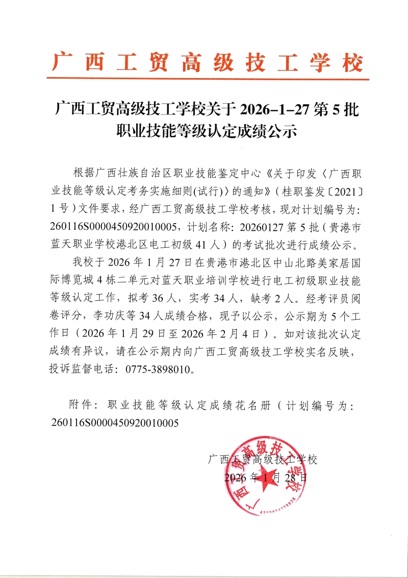广西工贸高级技工学校关于2026-1-27第5批职业技能等级认定成绩公示