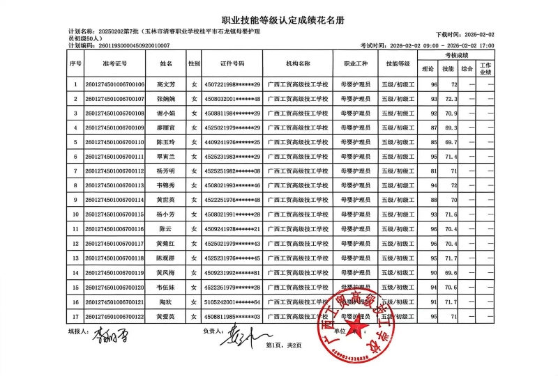 广西工贸高级技工学校关于2026-2-2第7批职业技能等级认定成绩公示