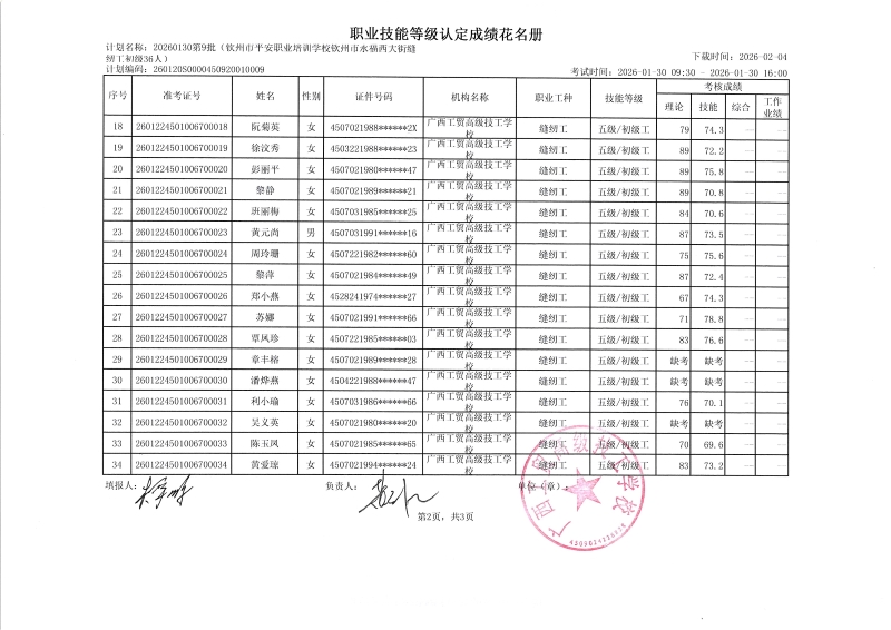 广西工贸高级技工学校关于2026-02-01第10批职业技能等级认定成绩公示