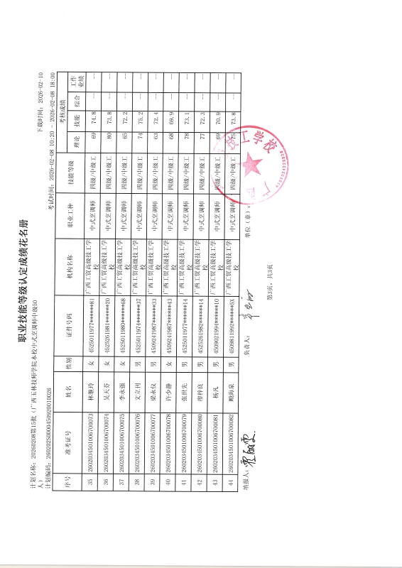 广西工贸高级技工学校关于2026-02-08第15批职业技能等级认定成绩公示
