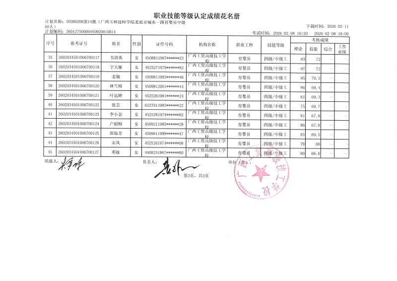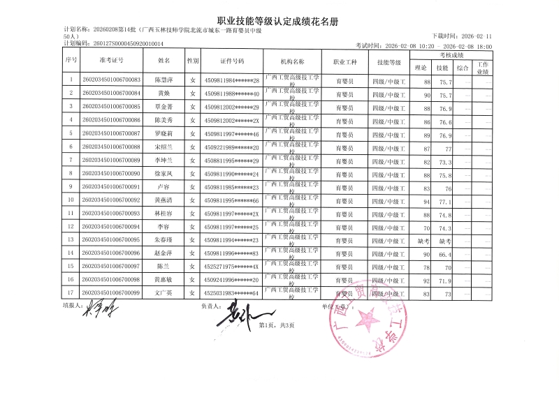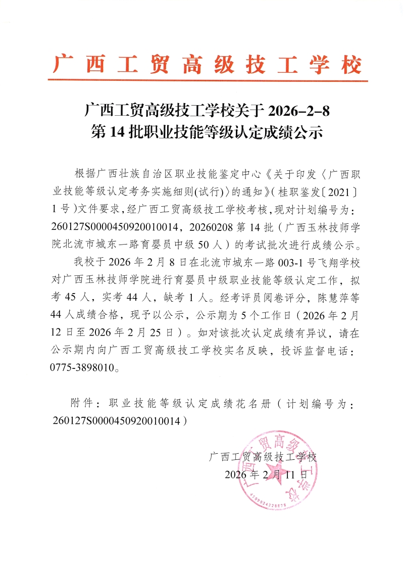 广西工贸高级技工学校关于2026-2-8第14批职业技能等级认定成绩公示