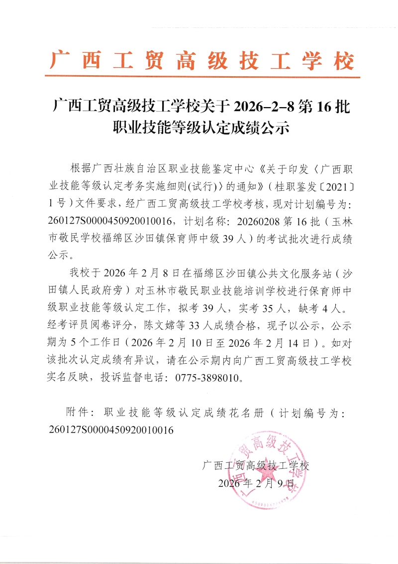广西工贸高级技工学校关于2026-2-8第16批职业技能等级认定成绩公示