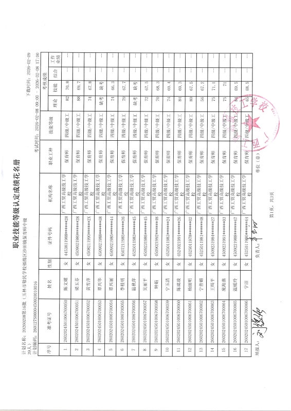 广西工贸高级技工学校关于2026-02-08第15批职业技能等级认定成绩公示