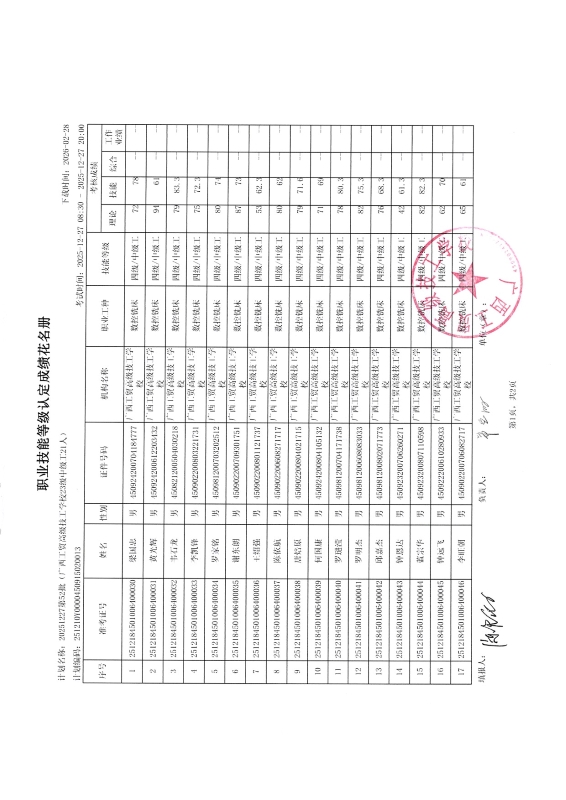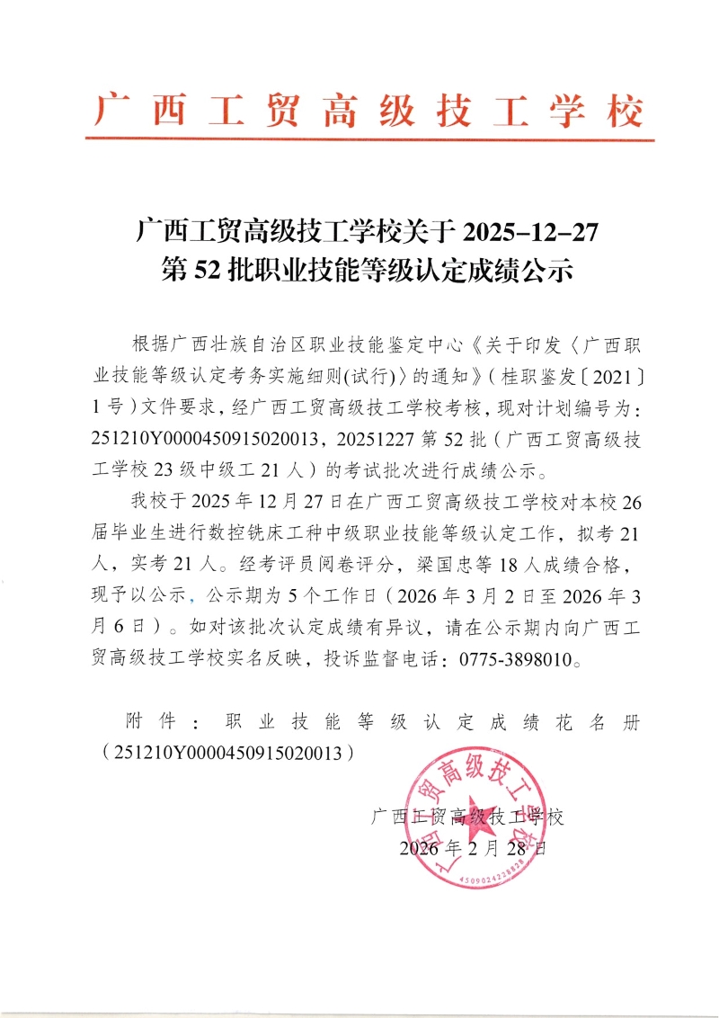 广西工贸高级技工学校关于2025-12-27第52批职业技能等级认定成绩公示