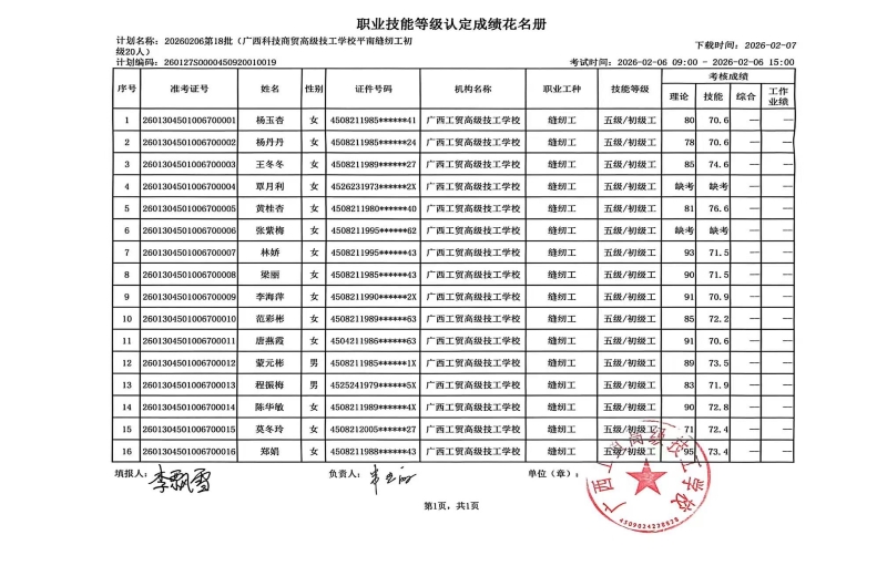 广西工贸高级技工学校关于2026-2-8第16批职业技能等级认定成绩公示