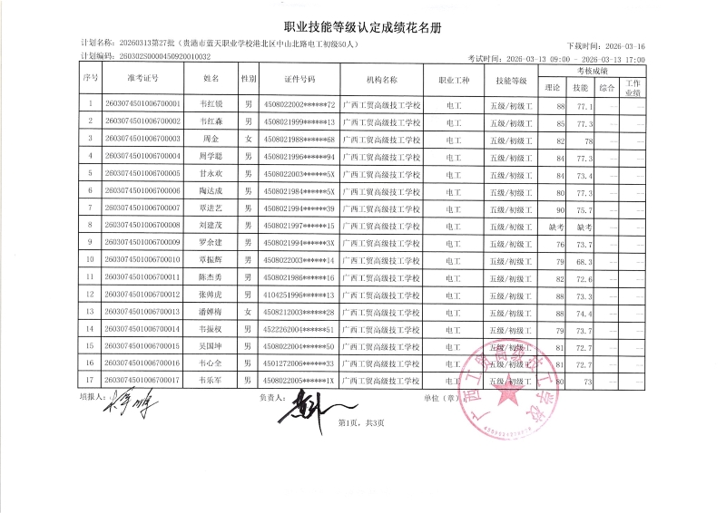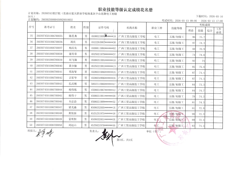 广西工贸高级技工学校关于2026-03-13第27批职业技能等级认定成绩公示