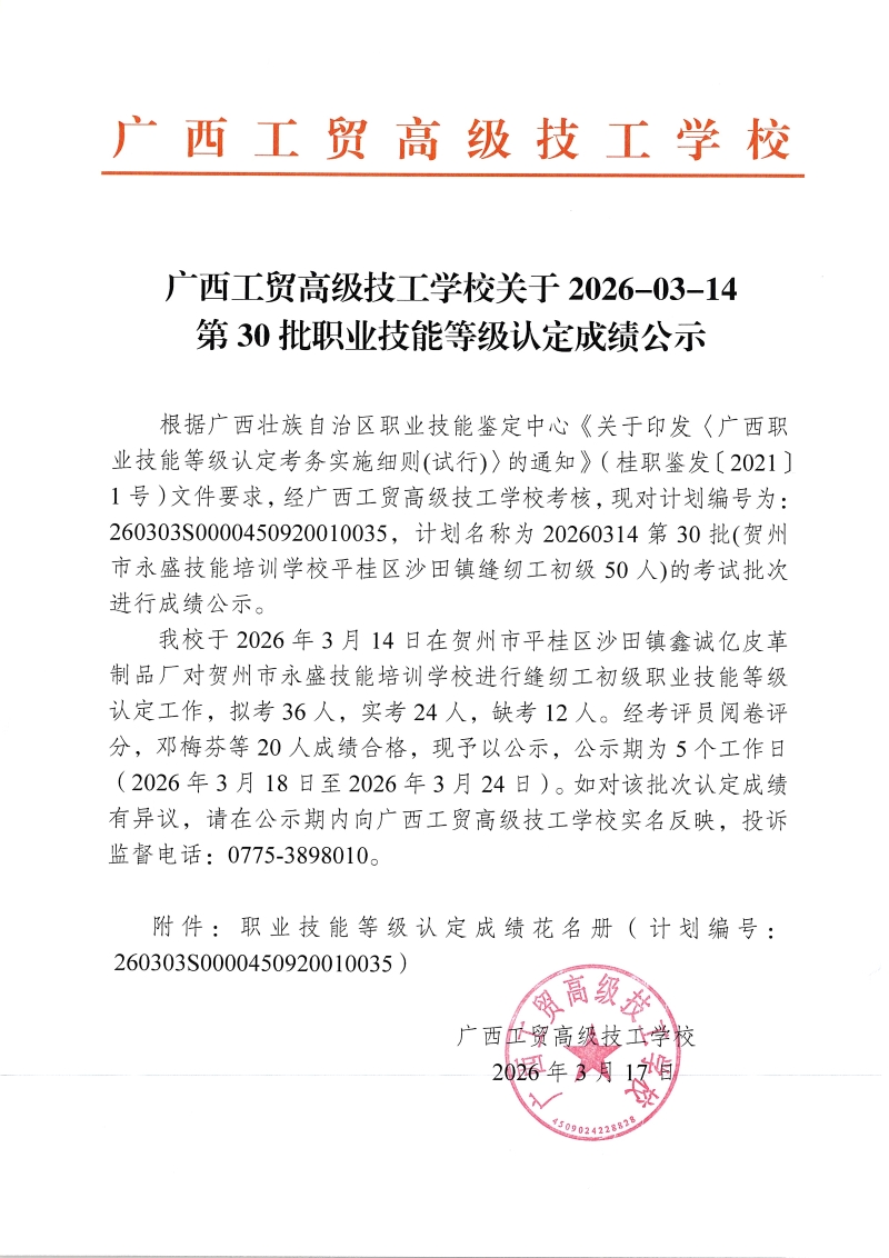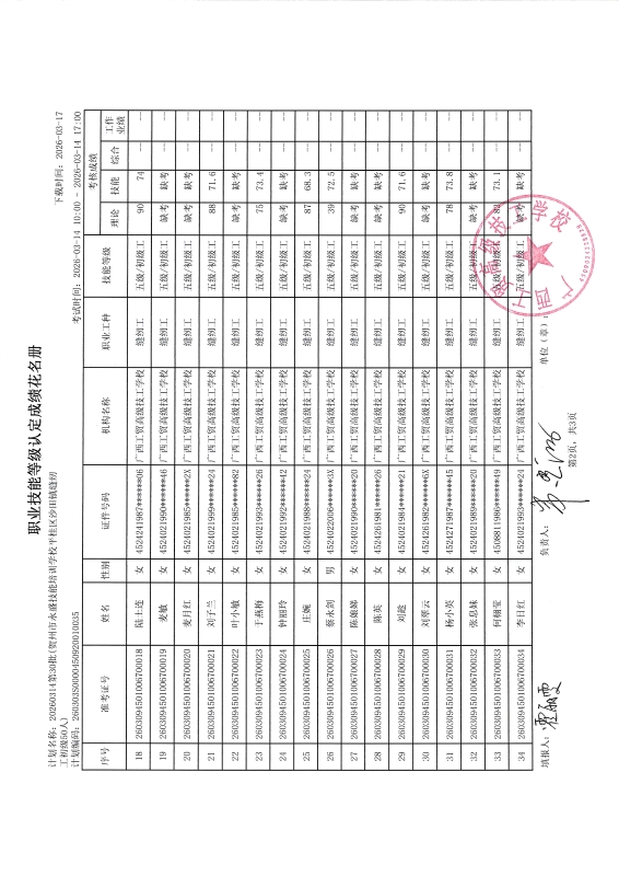 广西工贸高级技工学校关于2026-03-14第30批职业技能等级认定成绩公示