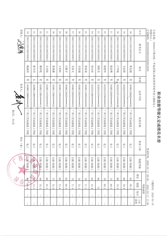 广西工贸高级技工学校关于2026-3-17第32批职业技能等级认定成绩公示