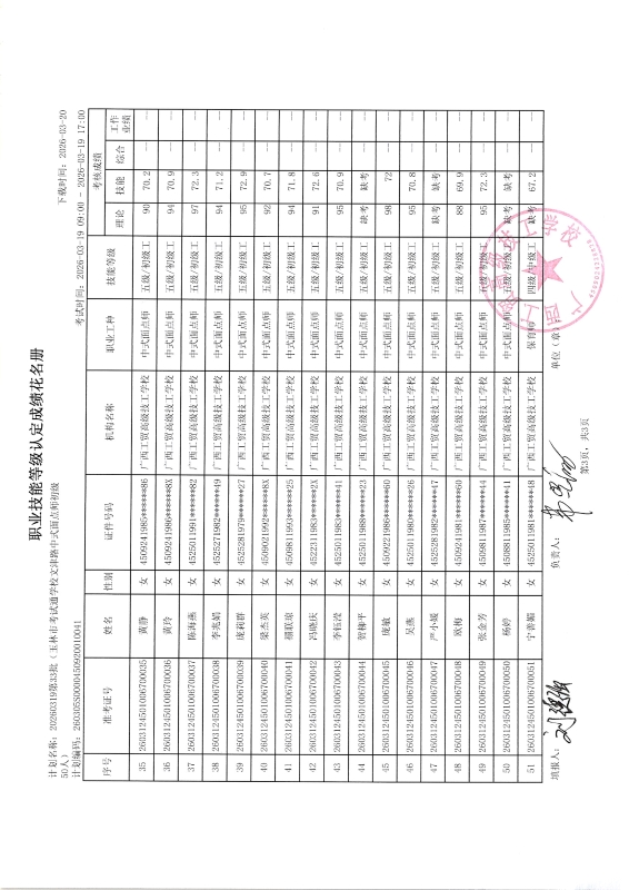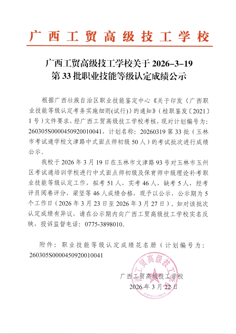 广西工贸高级技工学校关于2026-3-19第33批职业技能等级认定成绩公示