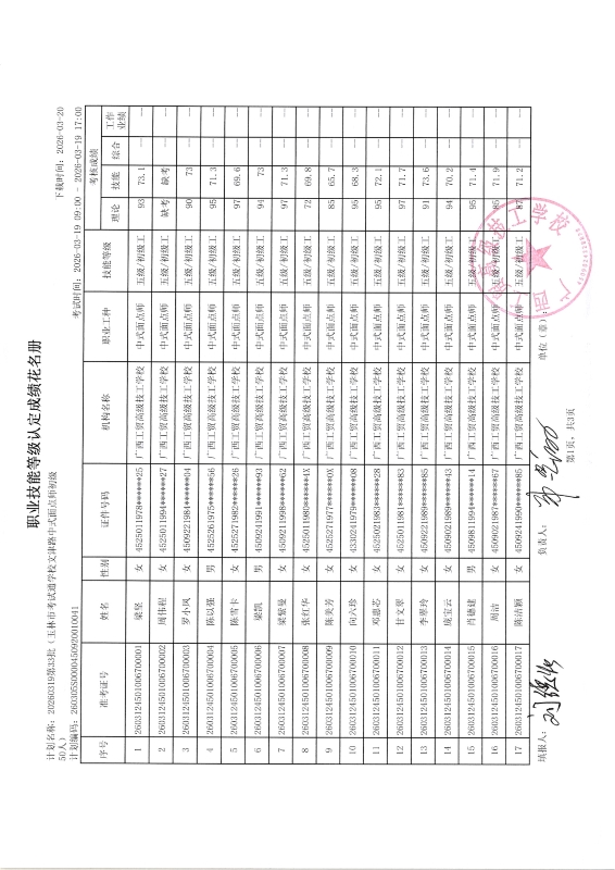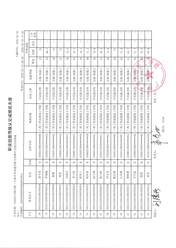 广西工贸高级技工学校关于2026-3-17第32批职业技能等级认定成绩公示
