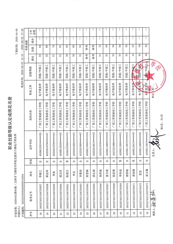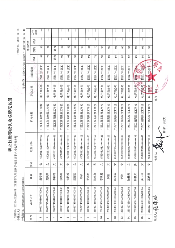 广西工贸高级技工学校关于2026-04-02第46批职业技能等级认定成绩公示