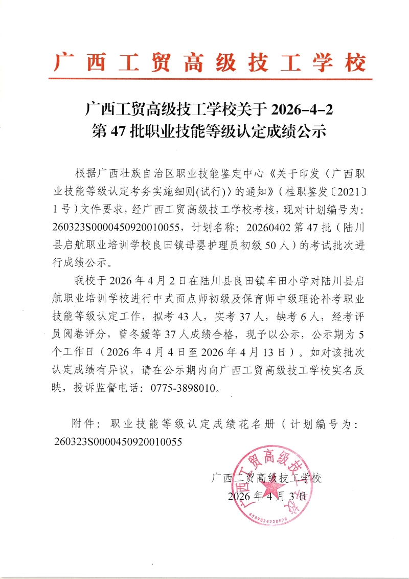 广西工贸高级技工学校关于2026-4-2第47批职业技能等级认定成绩公示