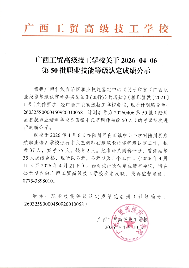 广西工贸高级技工学校关于2026-04-06第50批职业技能等级认定成绩公示