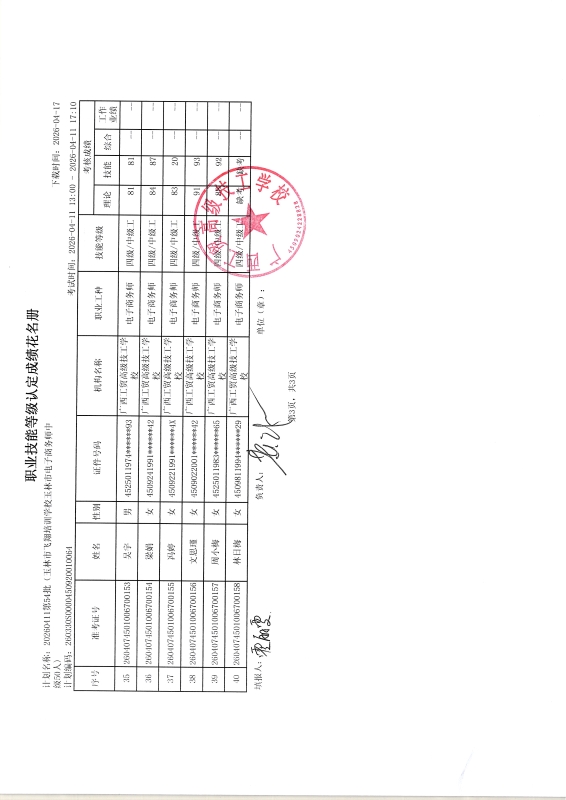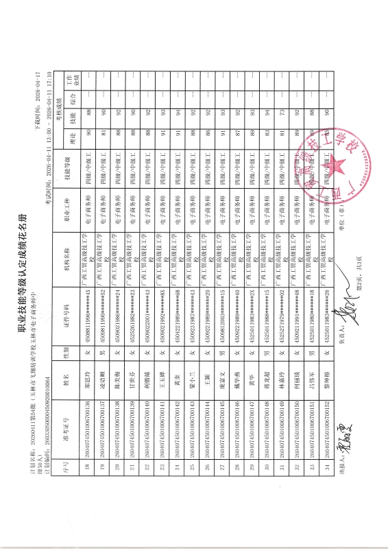 广西工贸高级技工学校关于2026-04-11第54批职业技能等级认定成绩公示