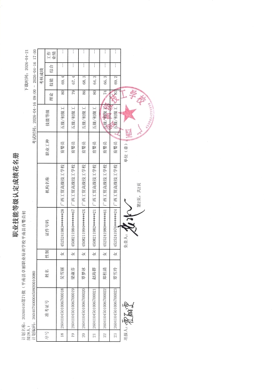 广西工贸高级技工学校关于2026-4-20第76批职业技能等级认定成绩公示